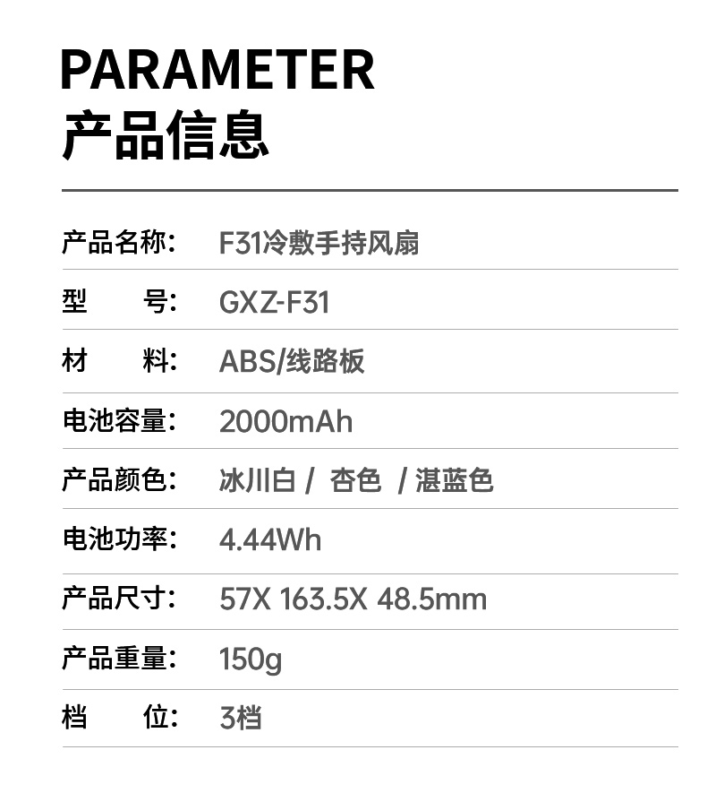 Working time: 10/5/2.5hours(Only Fan)1.7/1.5/1.2hour(Fan+Cooler)